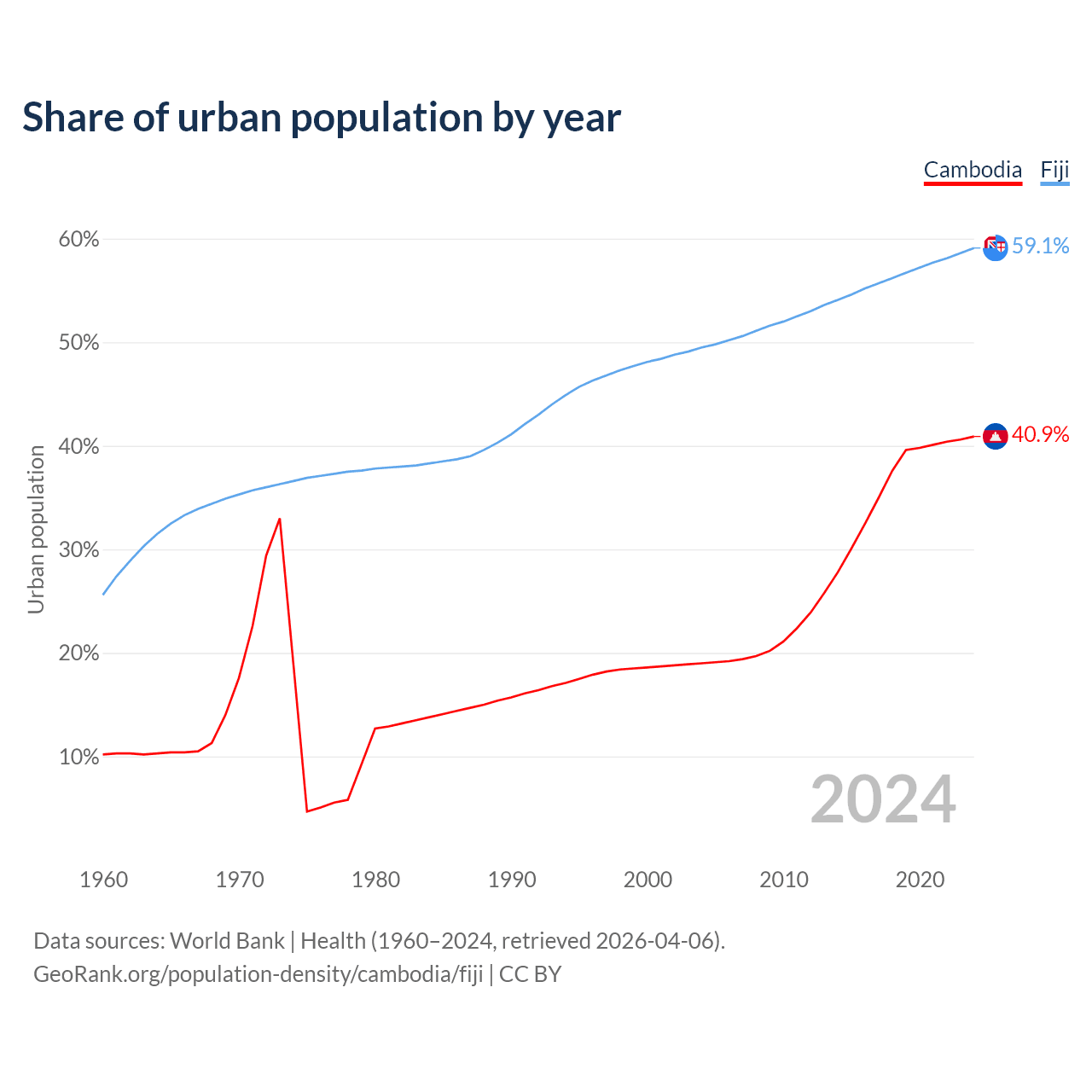 From 2004 to 2024, the share of urban population changed from 19% to 40.9% in Cambodia and from 49.5% to 59.1% in Fiji.