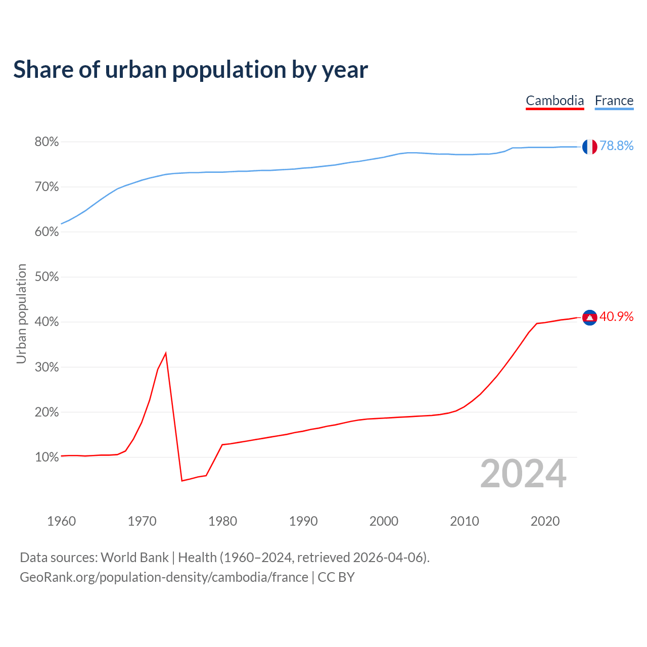 From 2004 to 2024, the share of urban population changed from 19% to 40.9% in Cambodia and from 77.5% to 78.8% in France.