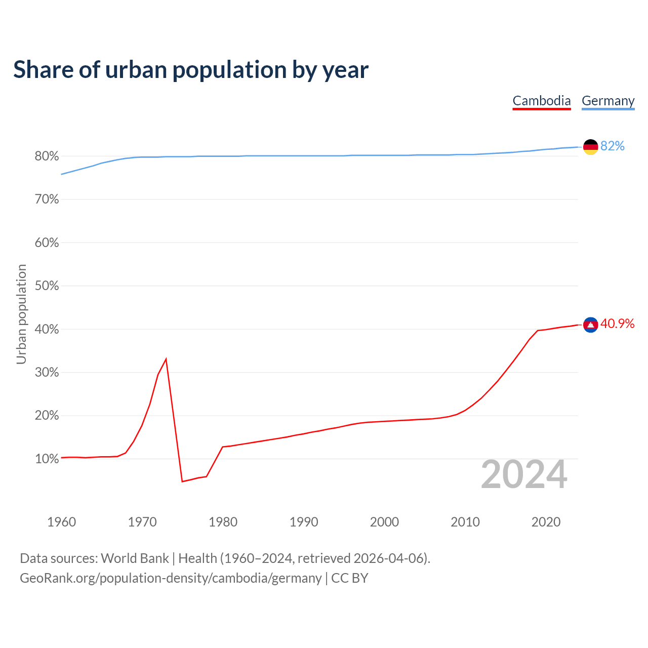 From 2004 to 2024, the share of urban population changed from 19% to 40.9% in Cambodia and from 80.2% to 82% in Germany.