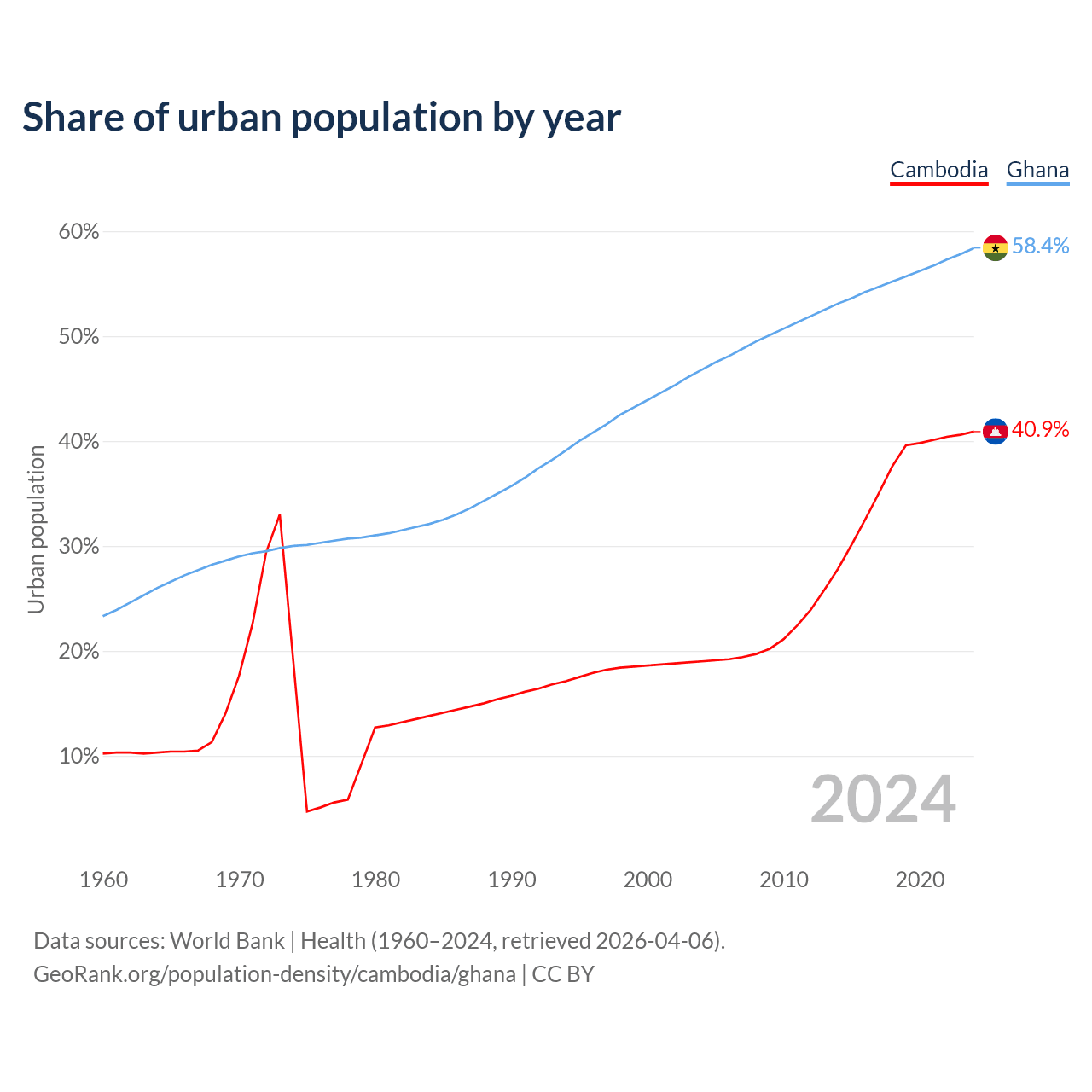 From 2004 to 2024, the share of urban population changed from 19% to 40.9% in Cambodia and from 46.8% to 58.4% in Ghana.