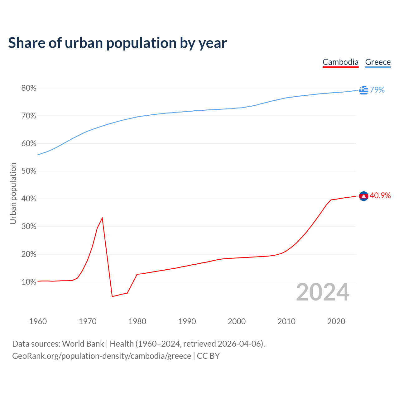From 2004 to 2024, the share of urban population changed from 19% to 40.9% in Cambodia and from 73.8% to 79% in Greece.