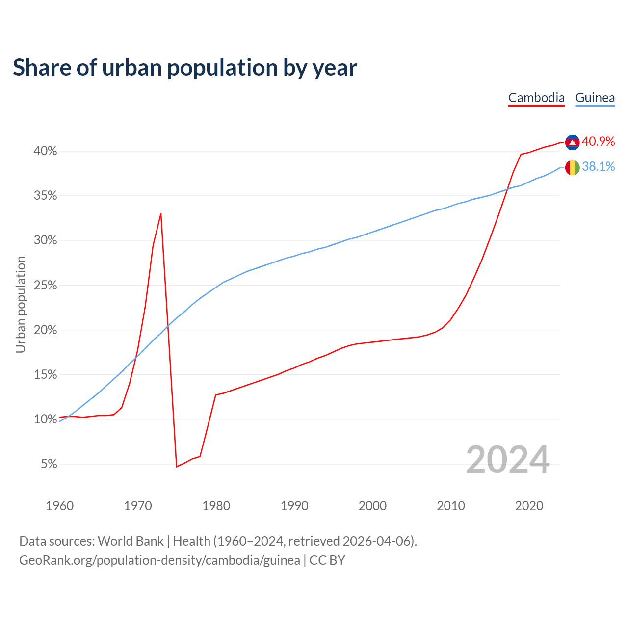 From 2004 to 2024, the share of urban population changed from 19% to 40.9% in Cambodia and from 32.1% to 38.1% in Guinea.