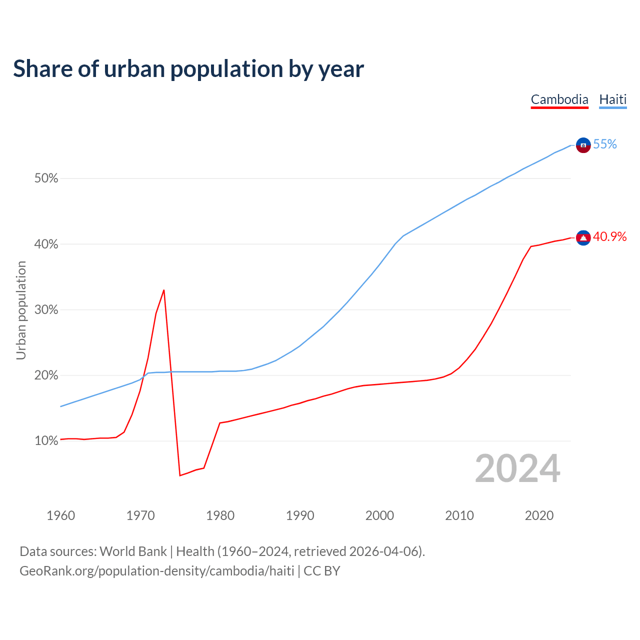 From 2004 to 2024, the share of urban population changed from 19% to 40.9% in Cambodia and from 41.9% to 55% in Haiti.