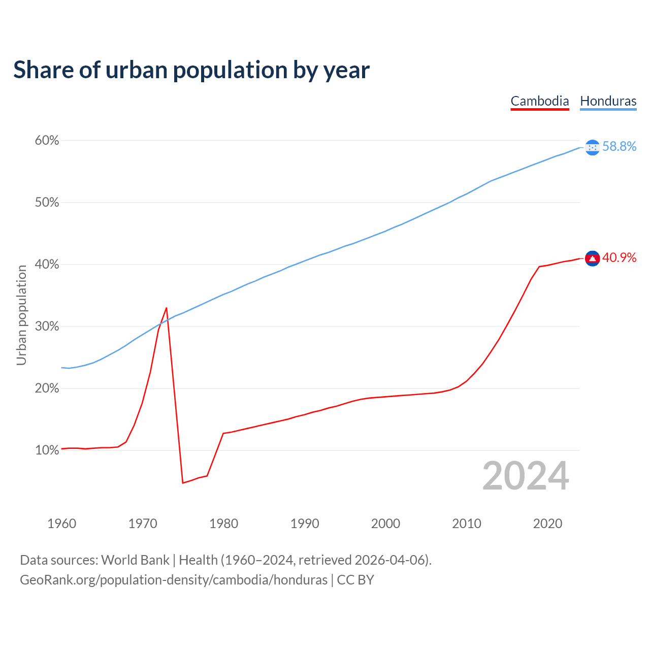 From 2004 to 2024, the share of urban population changed from 19% to 40.9% in Cambodia and from 47.6% to 58.8% in Honduras.