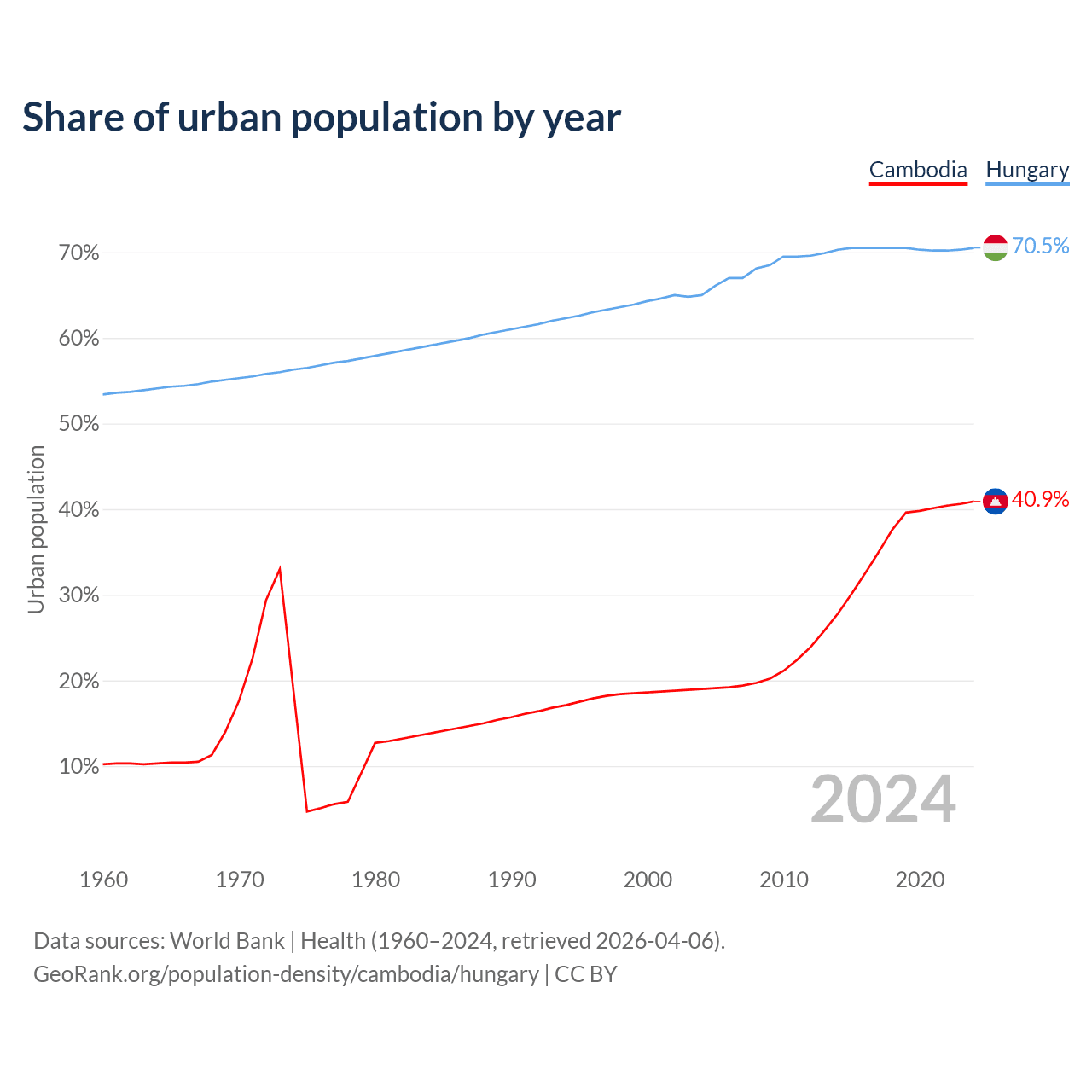 From 2004 to 2024, the share of urban population changed from 19% to 40.9% in Cambodia and from 65% to 70.5% in Hungary.