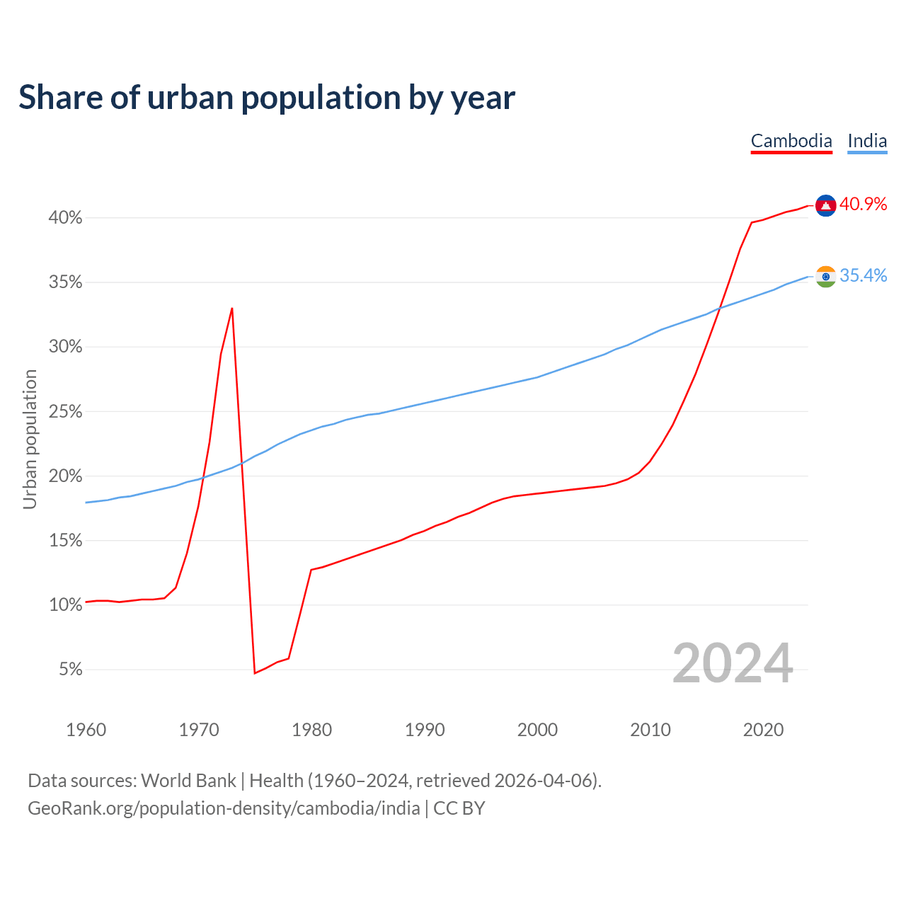 From 2006 to 2026, population density in Cambodia increased by 32.4%, compared to a 25.9% growth in India.