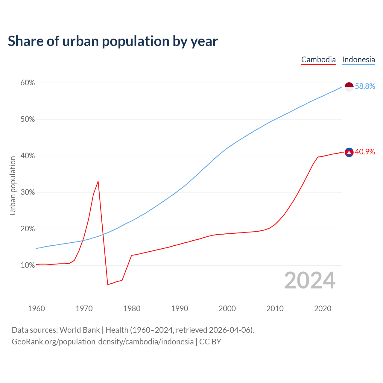 From 2004 to 2024, the share of urban population changed from 19% to 40.9% in Cambodia and from 45.4% to 58.8% in Indonesia.