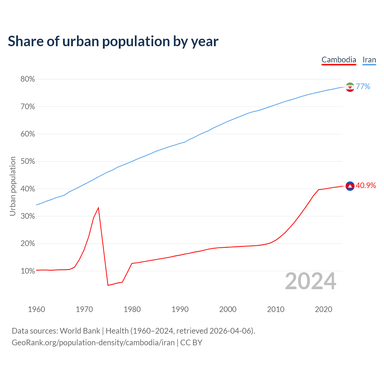 From 2004 to 2024, the share of urban population changed from 19% to 40.9% in Cambodia and from 67.3% to 77% in Iran.