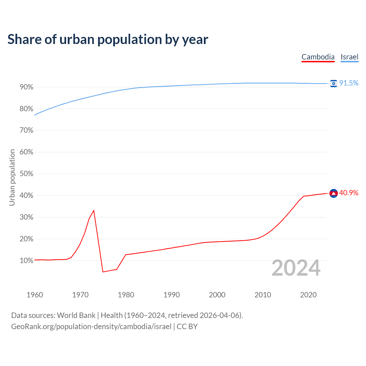 From 2004 to 2024, the share of urban population changed from 19% to 40.9% in Cambodia and from 91.6% to 91.5% in Israel.