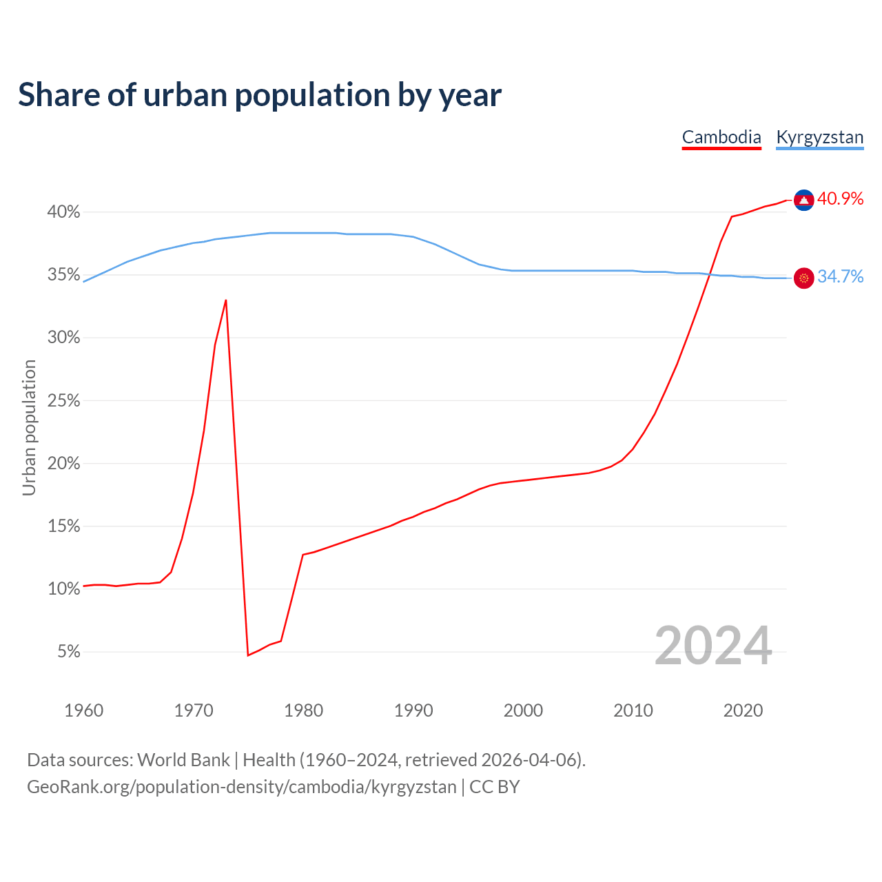 From 2004 to 2024, the share of urban population changed from 19% to 40.9% in Cambodia and from 35.3% to 34.7% in Kyrgyzstan.