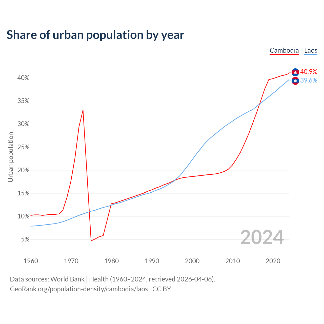 From 2004 to 2024, the share of urban population changed from 19% to 40.9% in Cambodia and from 26.5% to 39.6% in Laos.