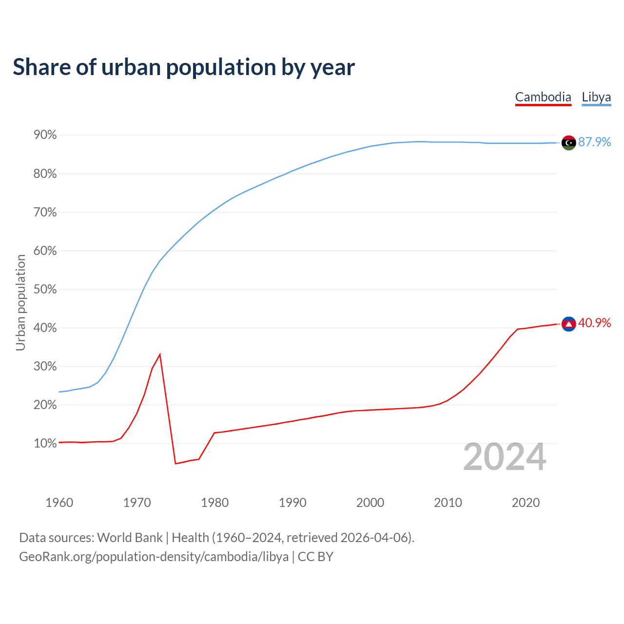 From 2004 to 2024, the share of urban population changed from 19% to 40.9% in Cambodia and from 88% to 87.9% in Libya.