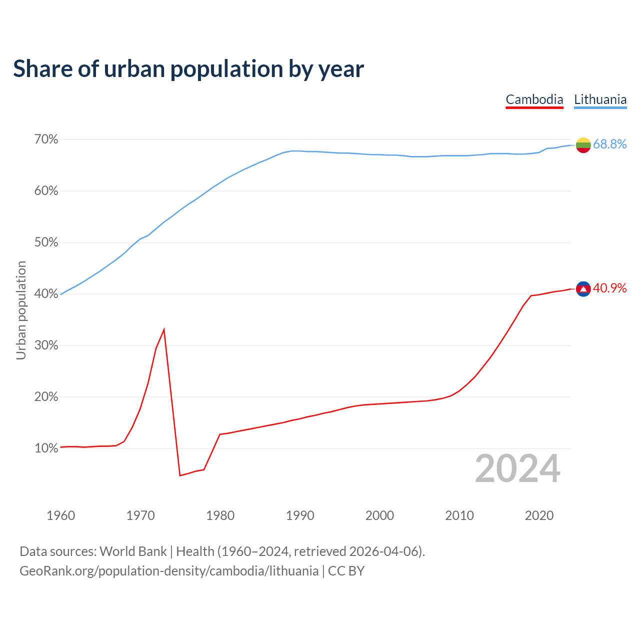 From 2004 to 2024, the share of urban population changed from 19% to 40.9% in Cambodia and from 66.6% to 68.8% in Lithuania.