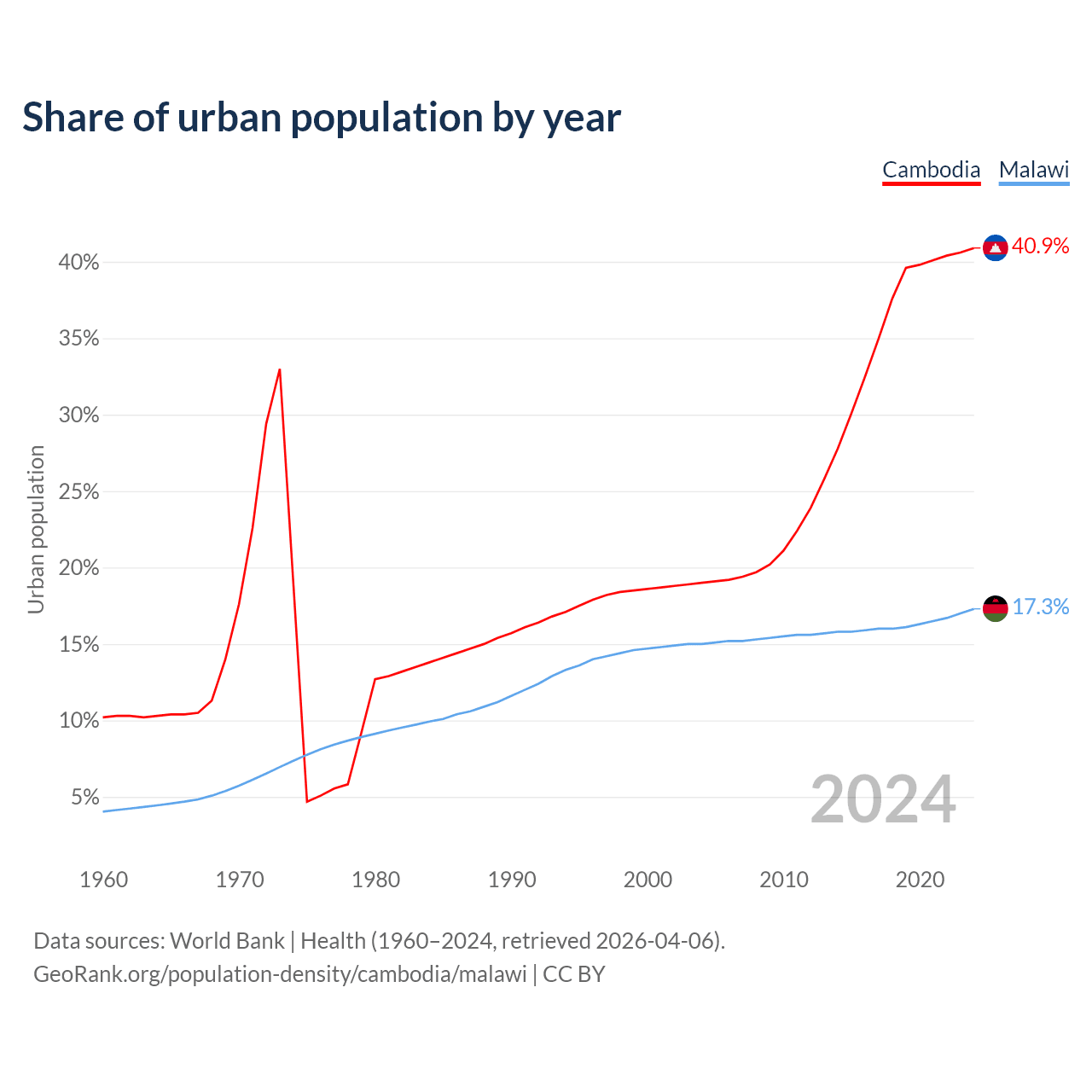 From 2004 to 2024, the share of urban population changed from 19% to 40.9% in Cambodia and from 15% to 17.3% in Malawi.