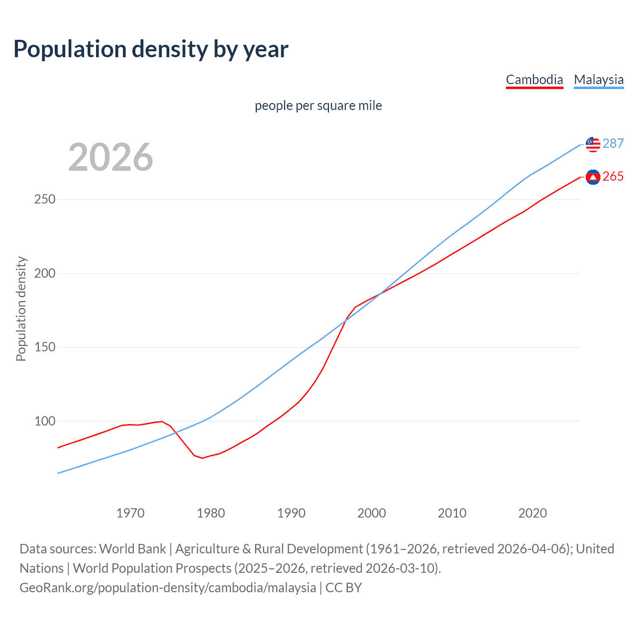 From 2006 to 2026, population density in Cambodia increased by 32.4%, compared to a 37.8% growth in Malaysia.