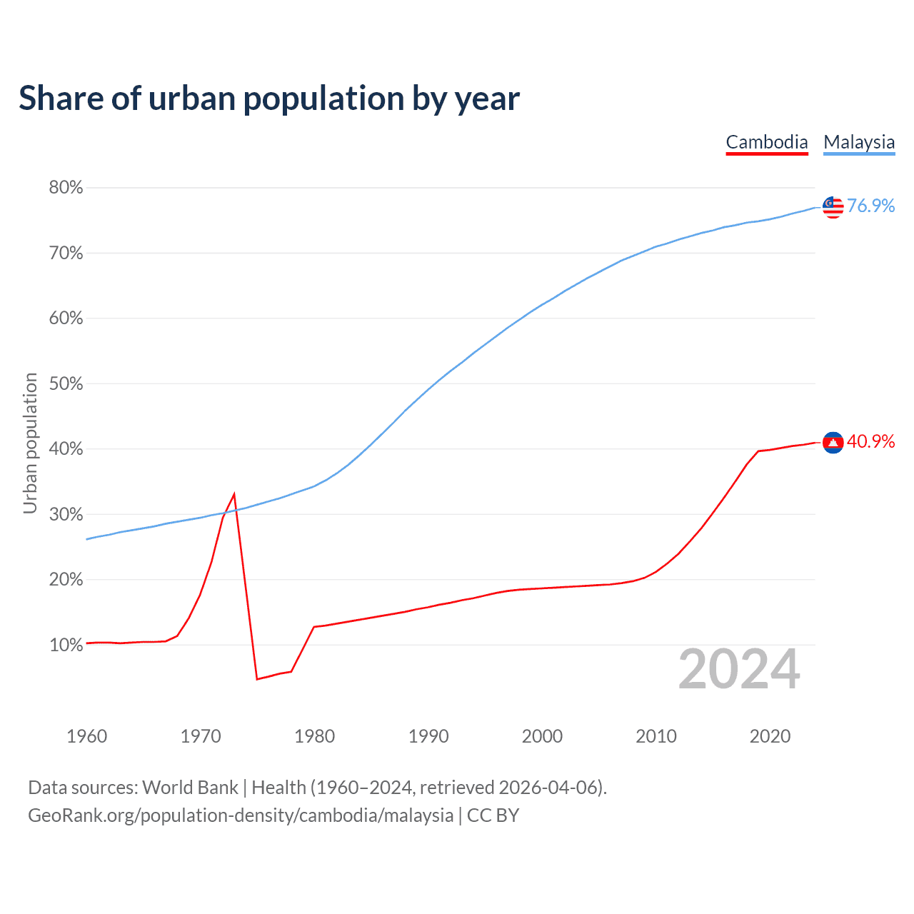 From 2004 to 2024, the share of urban population changed from 19% to 40.9% in Cambodia and from 66.1% to 76.9% in Malaysia.