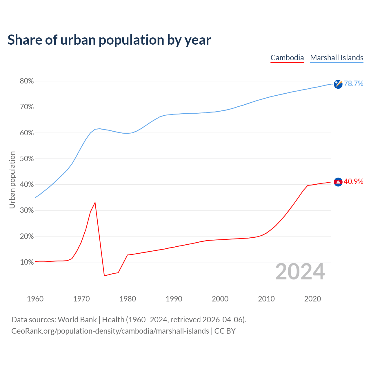 From 2004 to 2024, the share of urban population changed from 19% to 40.9% in Cambodia and from 70.1% to 78.7% in the Marshall Islands.