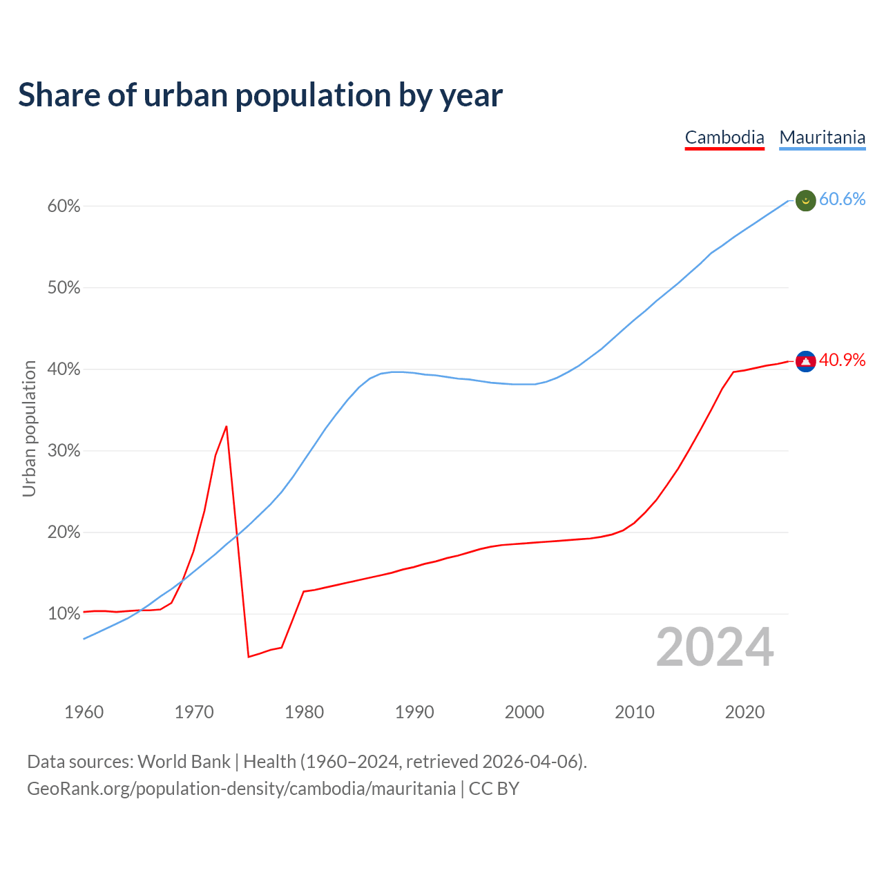 From 2004 to 2024, the share of urban population changed from 19% to 40.9% in Cambodia and from 39.6% to 60.6% in Mauritania.