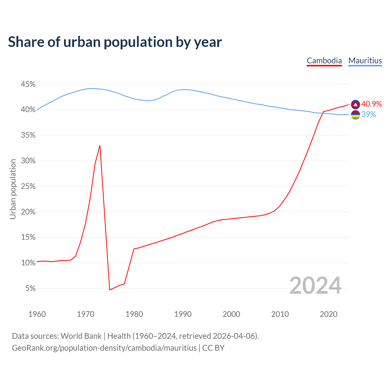 Cambodia has a population density of 265 people per square mile compared to 1,608 people in Mauritius. Cambodia has 110,475 sq ft of land per person vs 17,626 sq ft in Mauritius. Cambodia and Mauritius rank 92nd and 11th by population density, respectively.