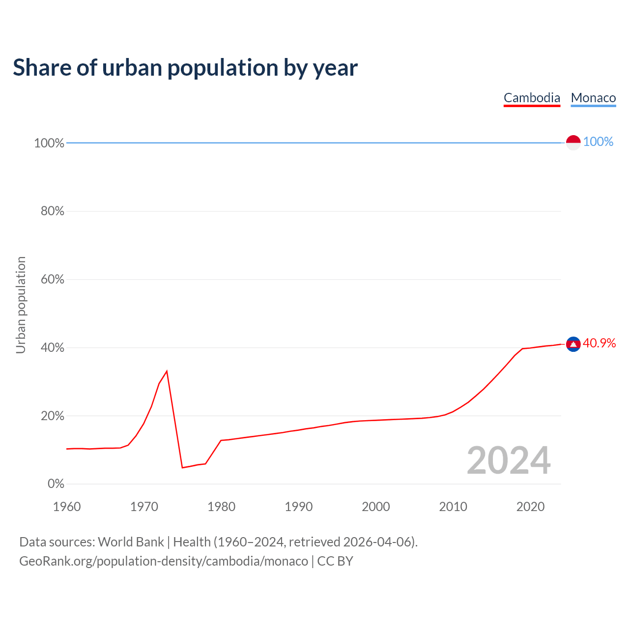 From 2004 to 2024, the share of urban population changed from 19% to 40.9% in Cambodia and from 100% to 100% in Monaco.