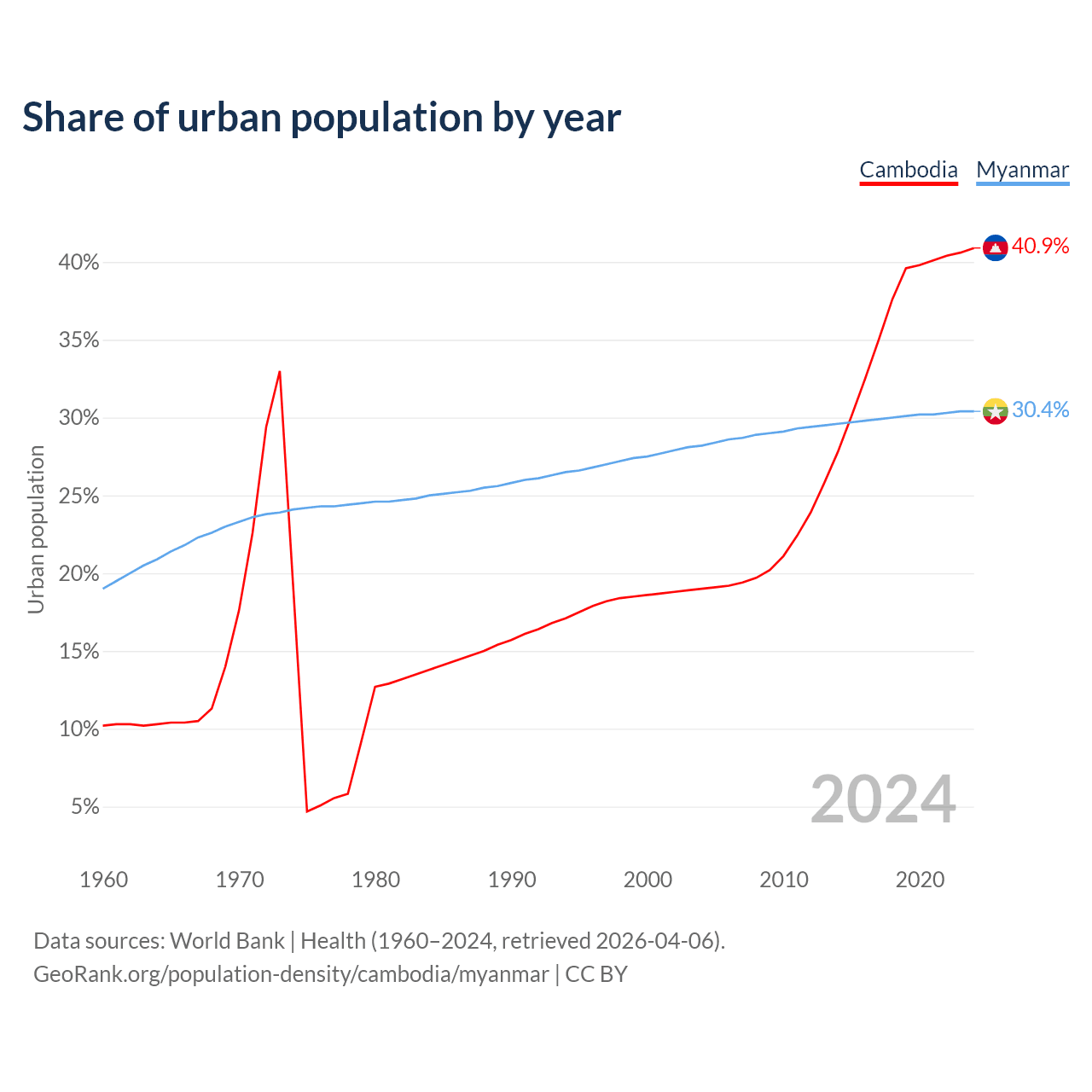 From 2004 to 2024, the share of urban population changed from 19% to 40.9% in Cambodia and from 28.2% to 30.4% in Myanmar.