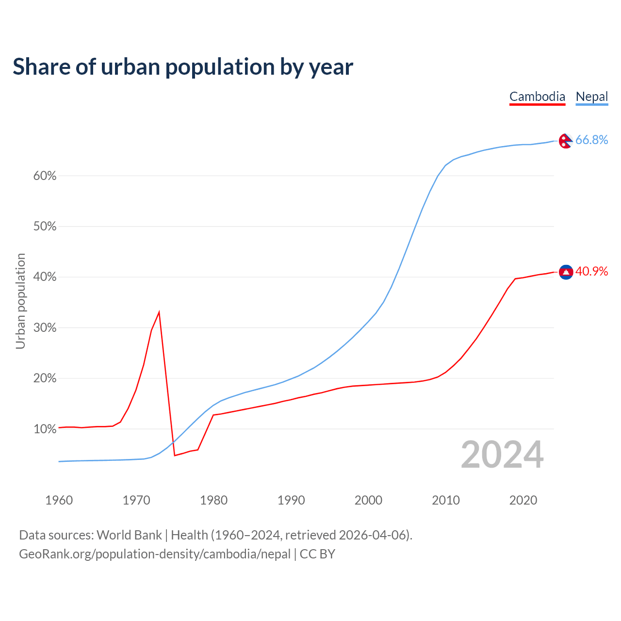 From 2004 to 2024, the share of urban population changed from 19% to 40.9% in Cambodia and from 41.6% to 66.8% in Nepal.