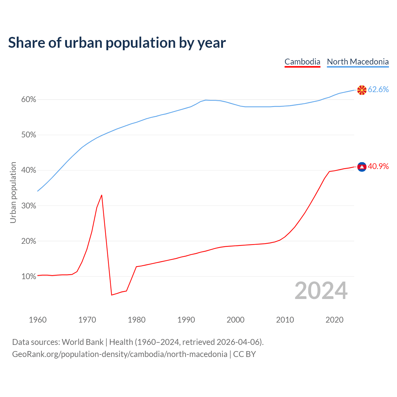 From 2004 to 2024, the share of urban population changed from 19% to 40.9% in Cambodia and from 57.9% to 62.6% in North Macedonia.