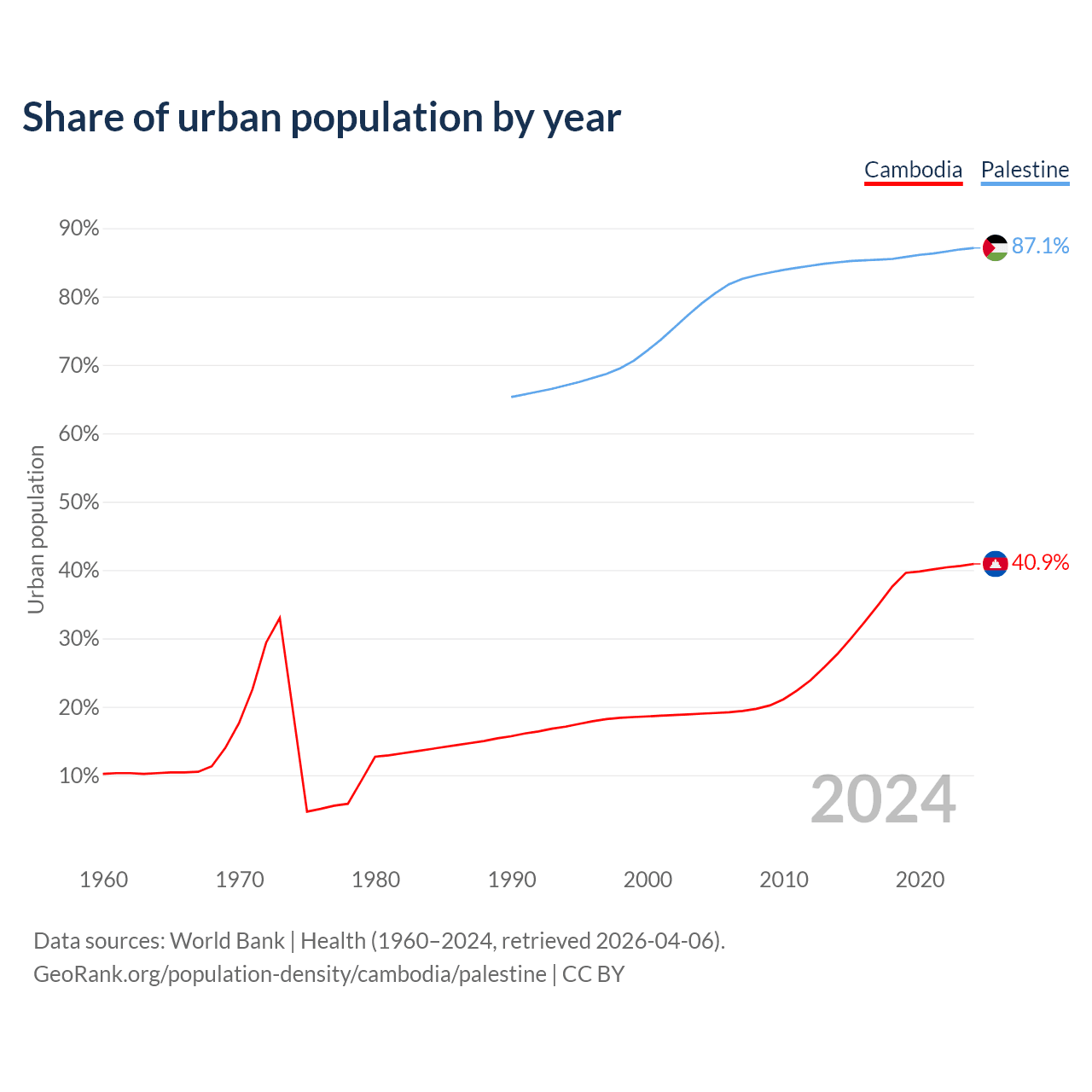 From 2004 to 2024, the share of urban population changed from 19% to 40.9% in Cambodia and from 79% to 87.1% in Palestine.
