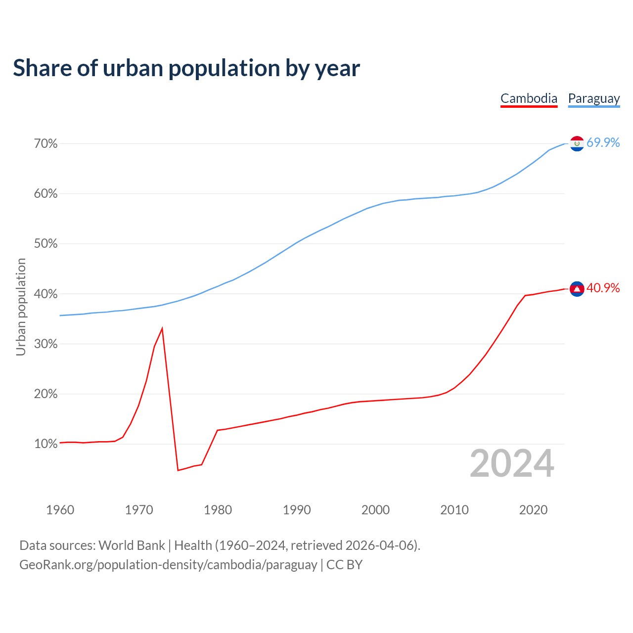 From 2004 to 2024, the share of urban population changed from 19% to 40.9% in Cambodia and from 58.7% to 69.9% in Paraguay.