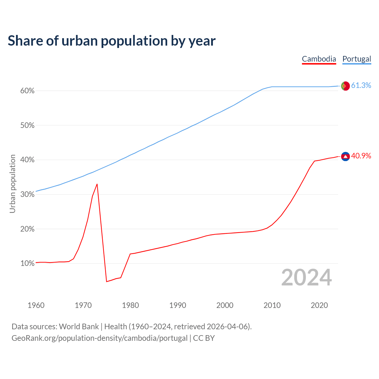 From 2004 to 2024, the share of urban population changed from 19% to 40.9% in Cambodia and from 57.4% to 61.3% in Portugal.