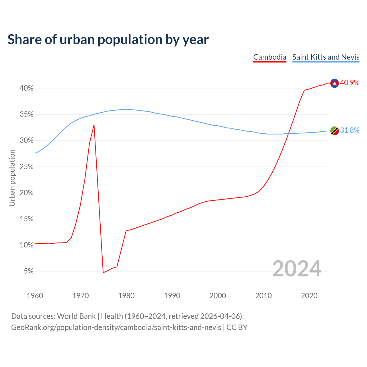 From 2004 to 2024, the share of urban population changed from 19% to 40.9% in Cambodia and from 32.1% to 31.8% in Saint Kitts and Nevis.