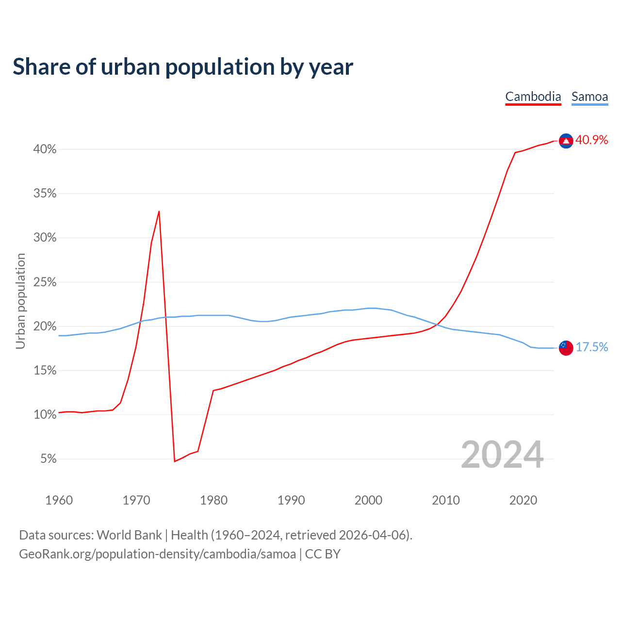 From 2004 to 2024, the share of urban population changed from 19% to 40.9% in Cambodia and from 21.5% to 17.5% in Samoa.