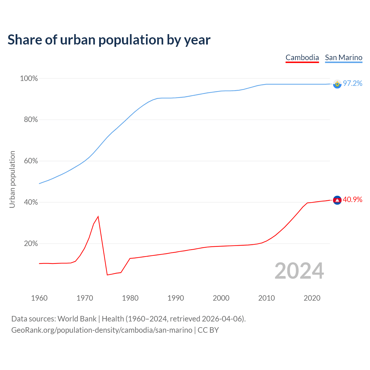 From 2006 to 2026, population density in Cambodia increased by 32.4%, compared to a 12.5% growth in San Marino.