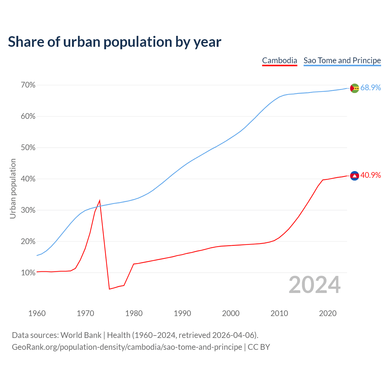 From 2004 to 2024, the share of urban population changed from 19% to 40.9% in Cambodia and from 57.9% to 68.9% in Sao Tome and Principe.