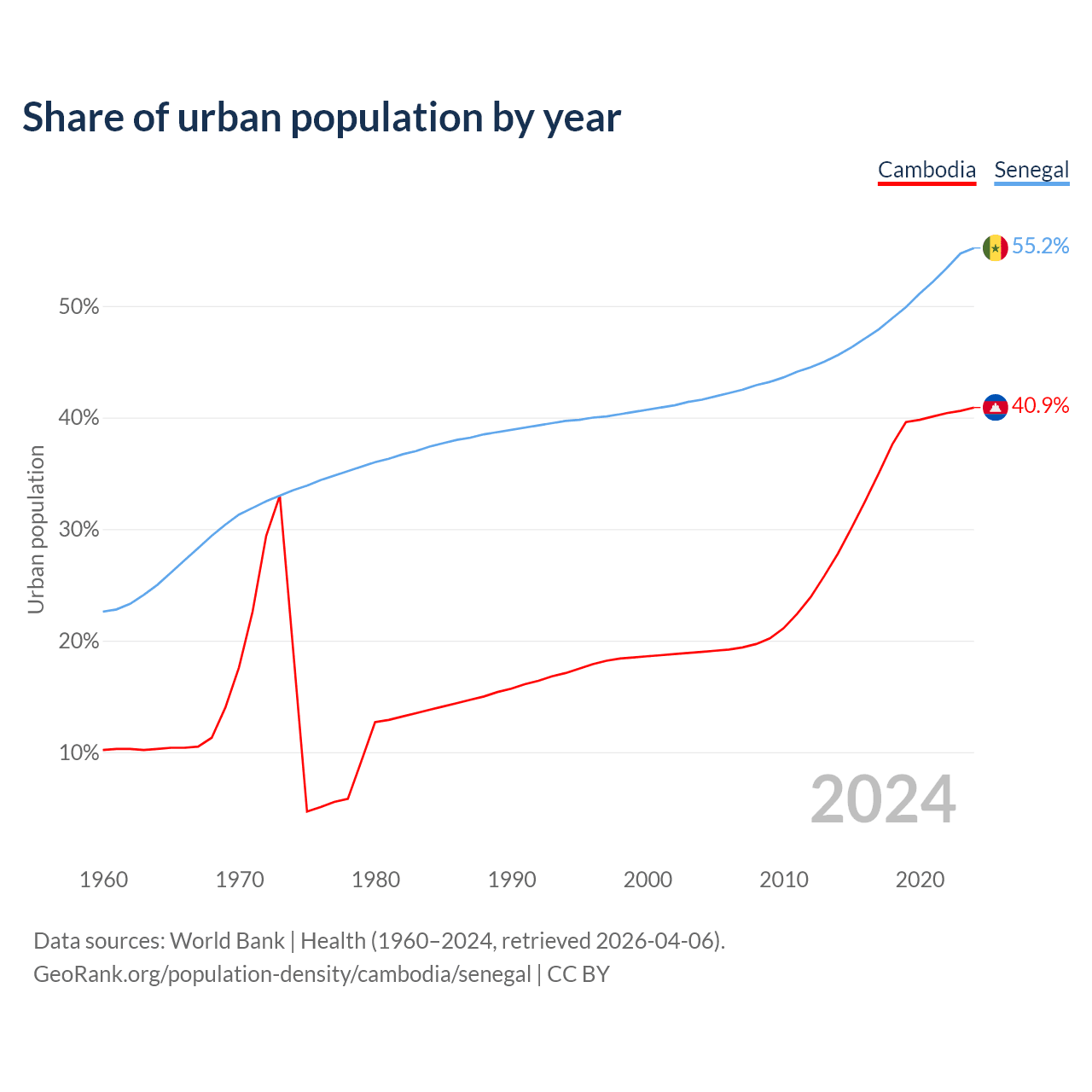 From 2004 to 2024, the share of urban population changed from 19% to 40.9% in Cambodia and from 41.6% to 55.2% in Senegal.
