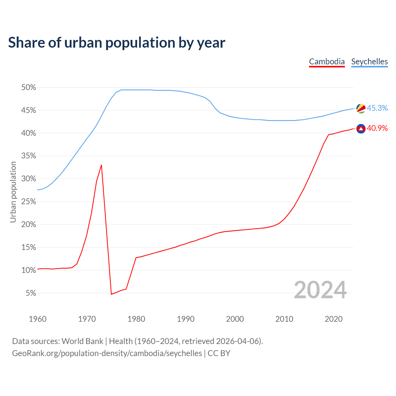 From 2004 to 2024, the share of urban population changed from 19% to 40.9% in Cambodia and from 42.9% to 45.3% in the Seychelles.