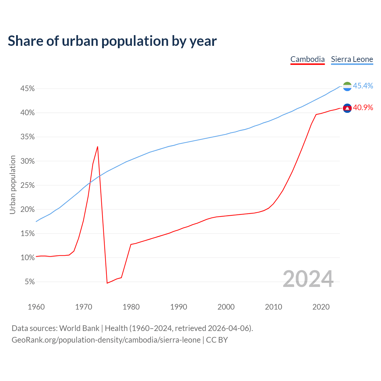 From 2004 to 2024, the share of urban population changed from 19% to 40.9% in Cambodia and from 36.5% to 45.4% in Sierra Leone.