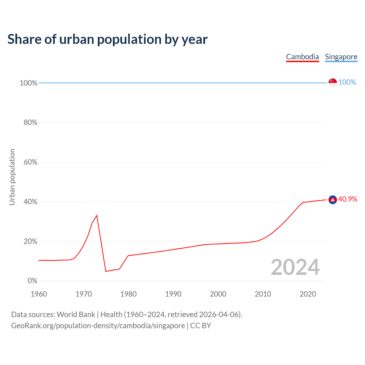From 2004 to 2024, the share of urban population changed from 19% to 40.9% in Cambodia and from 100% to 100% in Singapore.