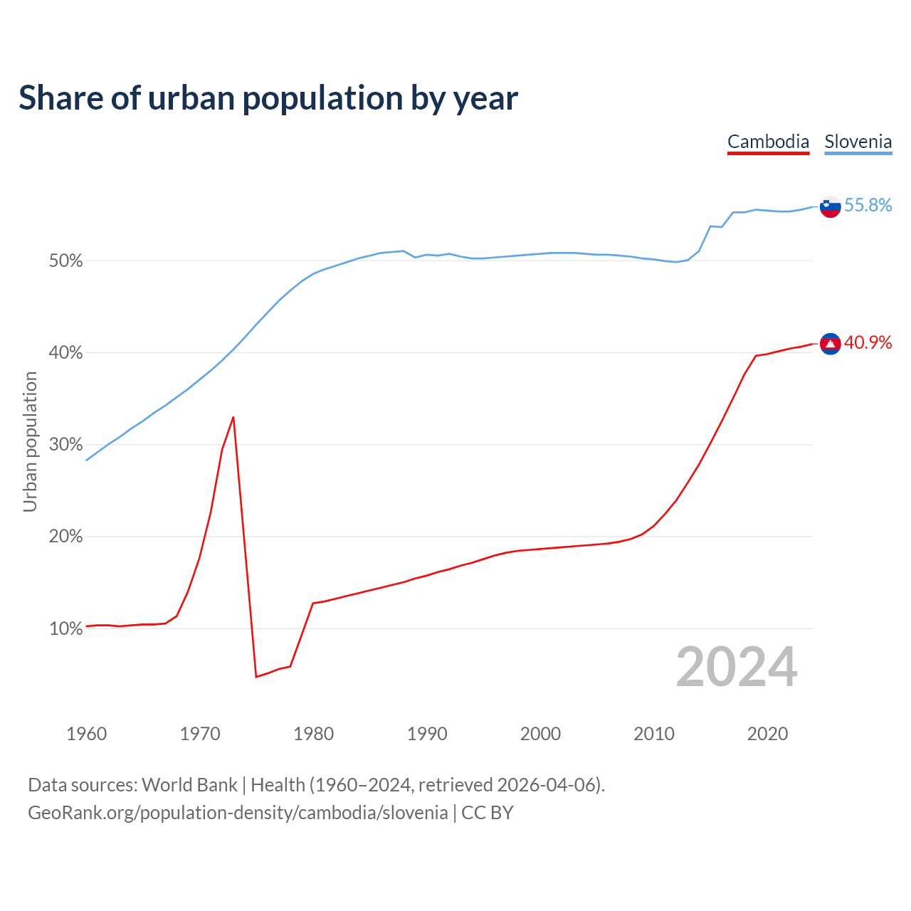 From 2006 to 2026, population density in Cambodia increased by 32.4%, compared to a 5.87% growth in Slovenia.
