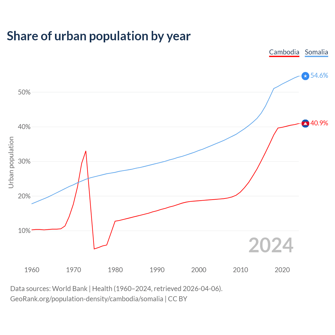 From 2004 to 2024, the share of urban population changed from 19% to 40.9% in Cambodia and from 35% to 54.6% in Somalia.