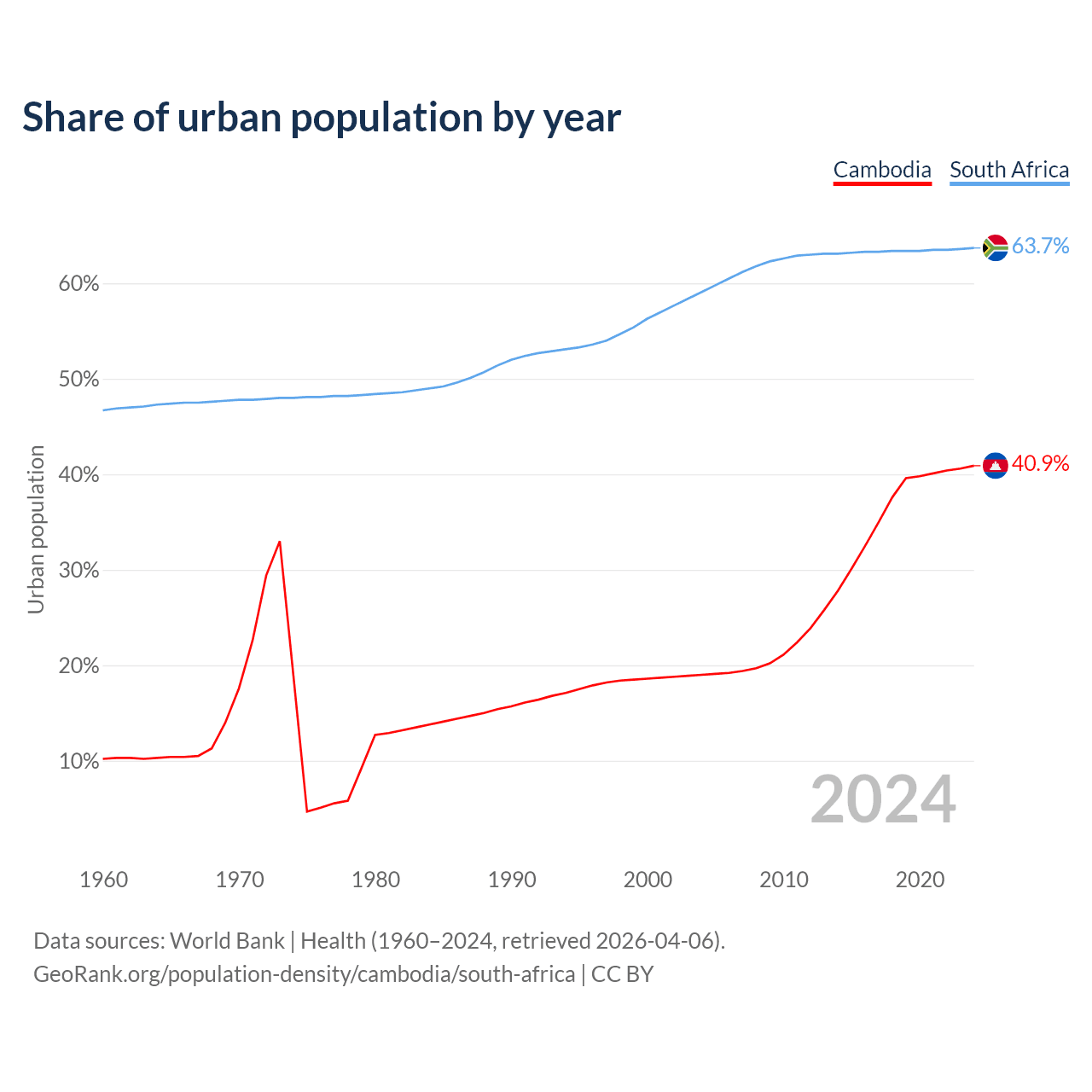 From 2006 to 2026, population density in Cambodia increased by 32.4%, compared to a 31% growth in South Africa.