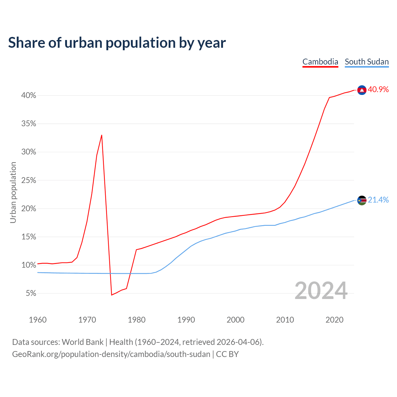 From 2004 to 2024, the share of urban population changed from 19% to 40.9% in Cambodia and from 16.8% to 21.4% in South Sudan.