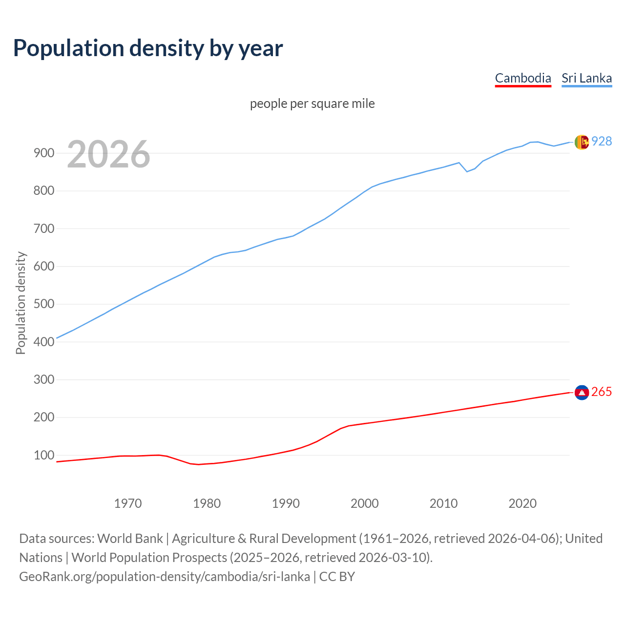 Cambodia has a population density of 265 people per square mile compared to 928 people in Sri Lanka. Cambodia has 110,475 sq ft of land per person vs 32,224 sq ft in Sri Lanka. Cambodia and Sri Lanka rank 92nd and 25th by population density, respectively.