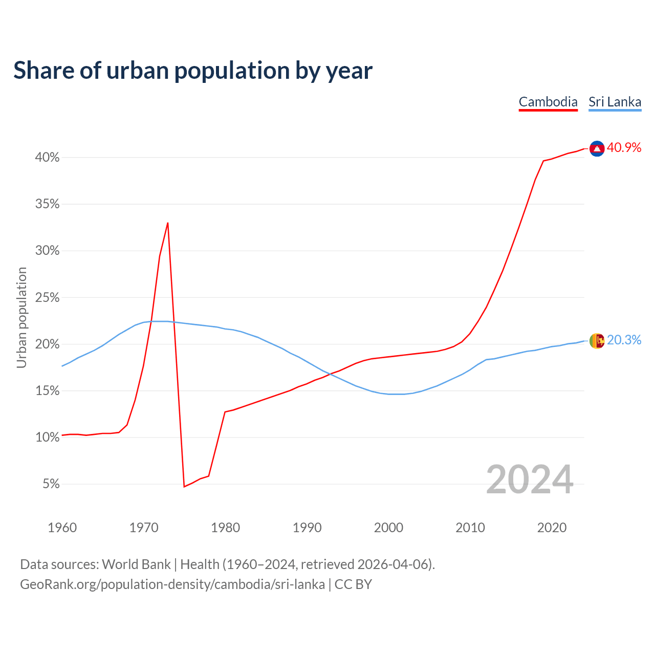 From 2004 to 2024, the share of urban population changed from 19% to 40.9% in Cambodia and from 14.9% to 20.3% in Sri Lanka.