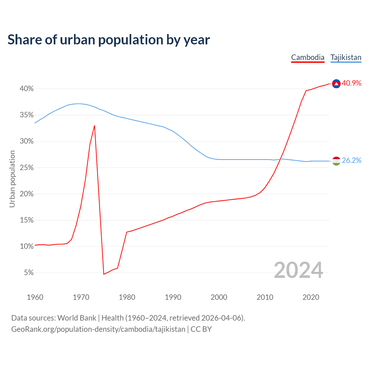 From 2004 to 2024, the share of urban population changed from 19% to 40.9% in Cambodia and from 26.5% to 26.2% in Tajikistan.