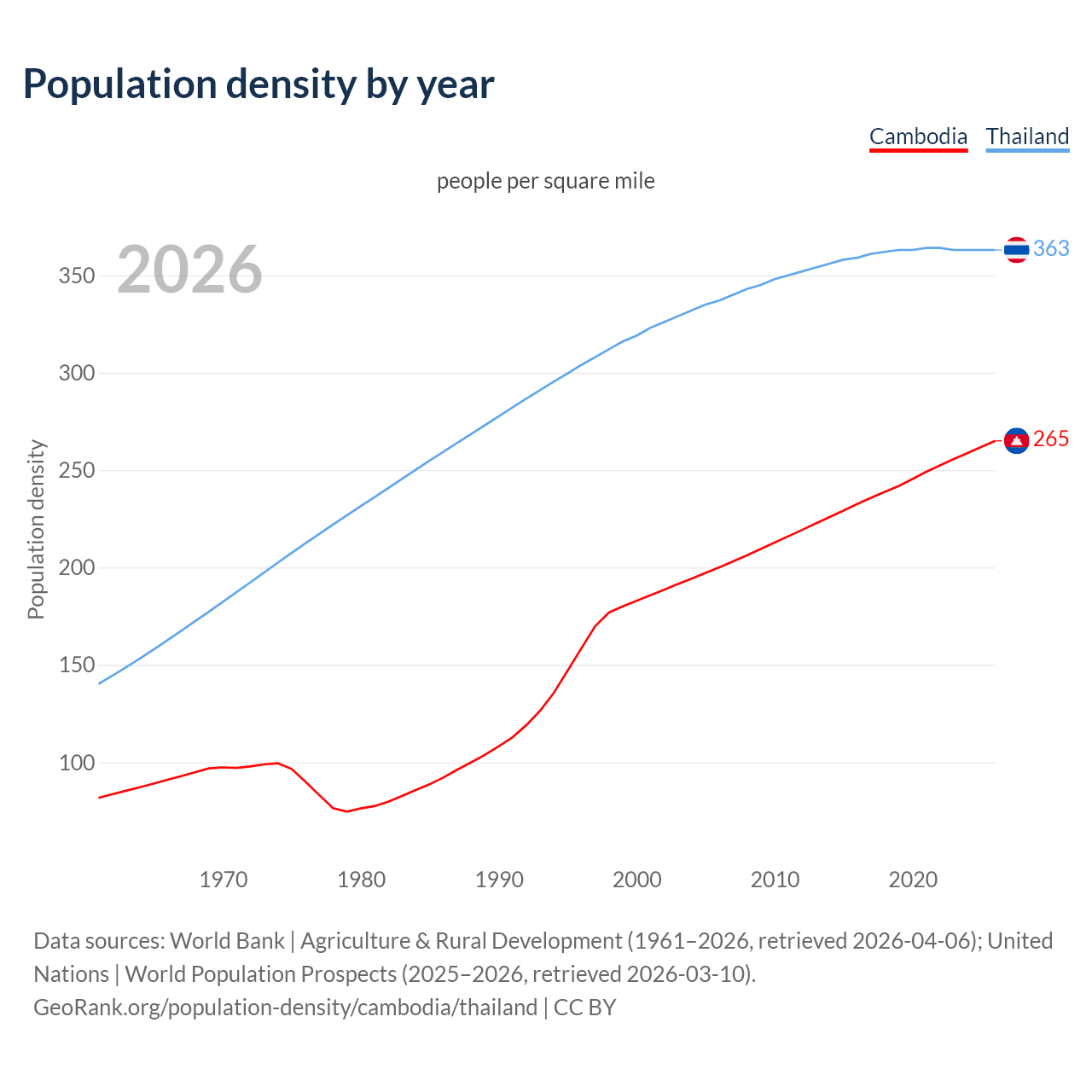 From 2006 to 2026, population density in Cambodia increased by 32.4%, compared to a 7.52% growth in Thailand.