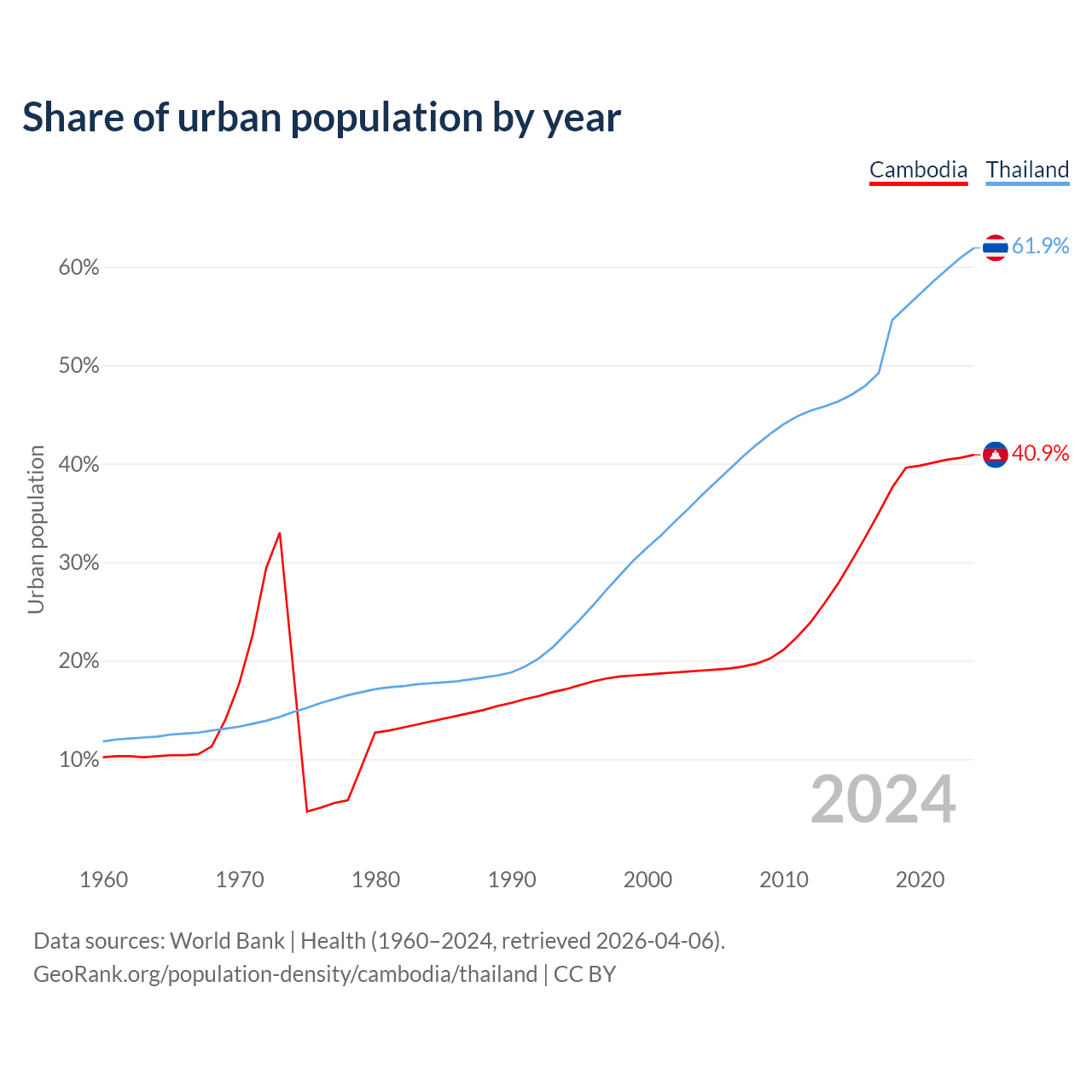 From 2004 to 2024, the share of urban population changed from 19% to 40.9% in Cambodia and from 36.8% to 61.9% in Thailand.