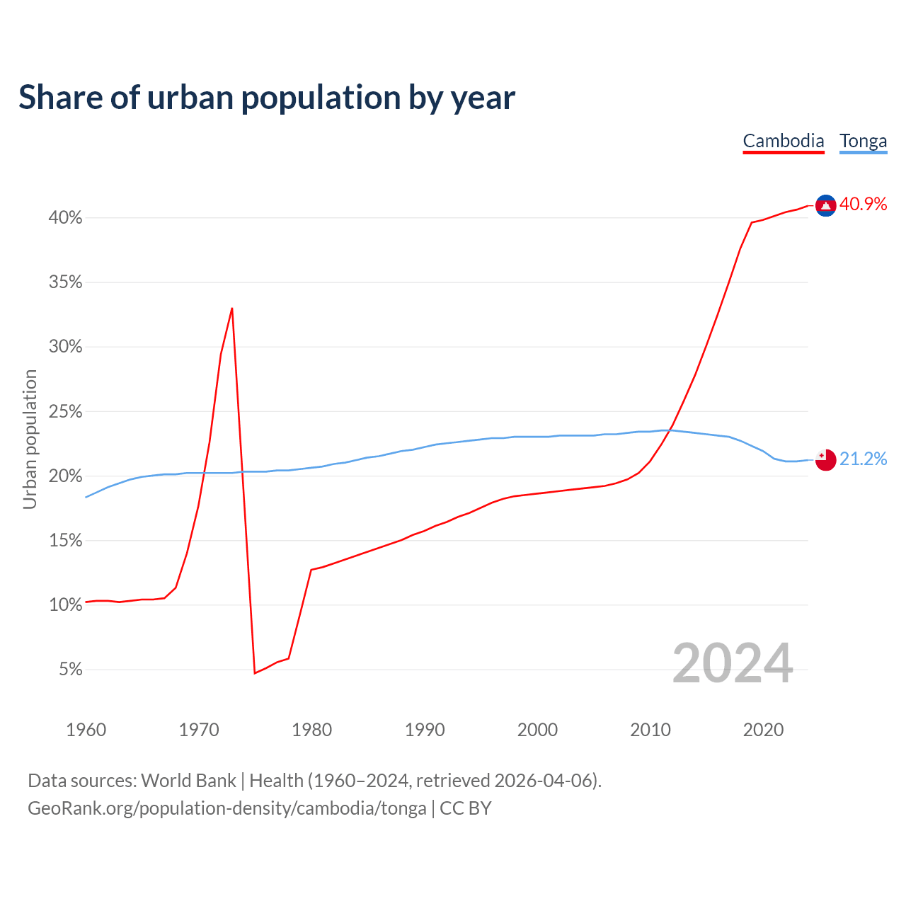 From 2004 to 2024, the share of urban population changed from 19% to 40.9% in Cambodia and from 23.1% to 21.2% in Tonga.
