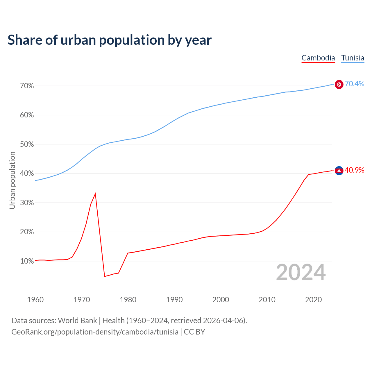 From 2004 to 2024, the share of urban population changed from 19% to 40.9% in Cambodia and from 64.9% to 70.4% in Tunisia.
