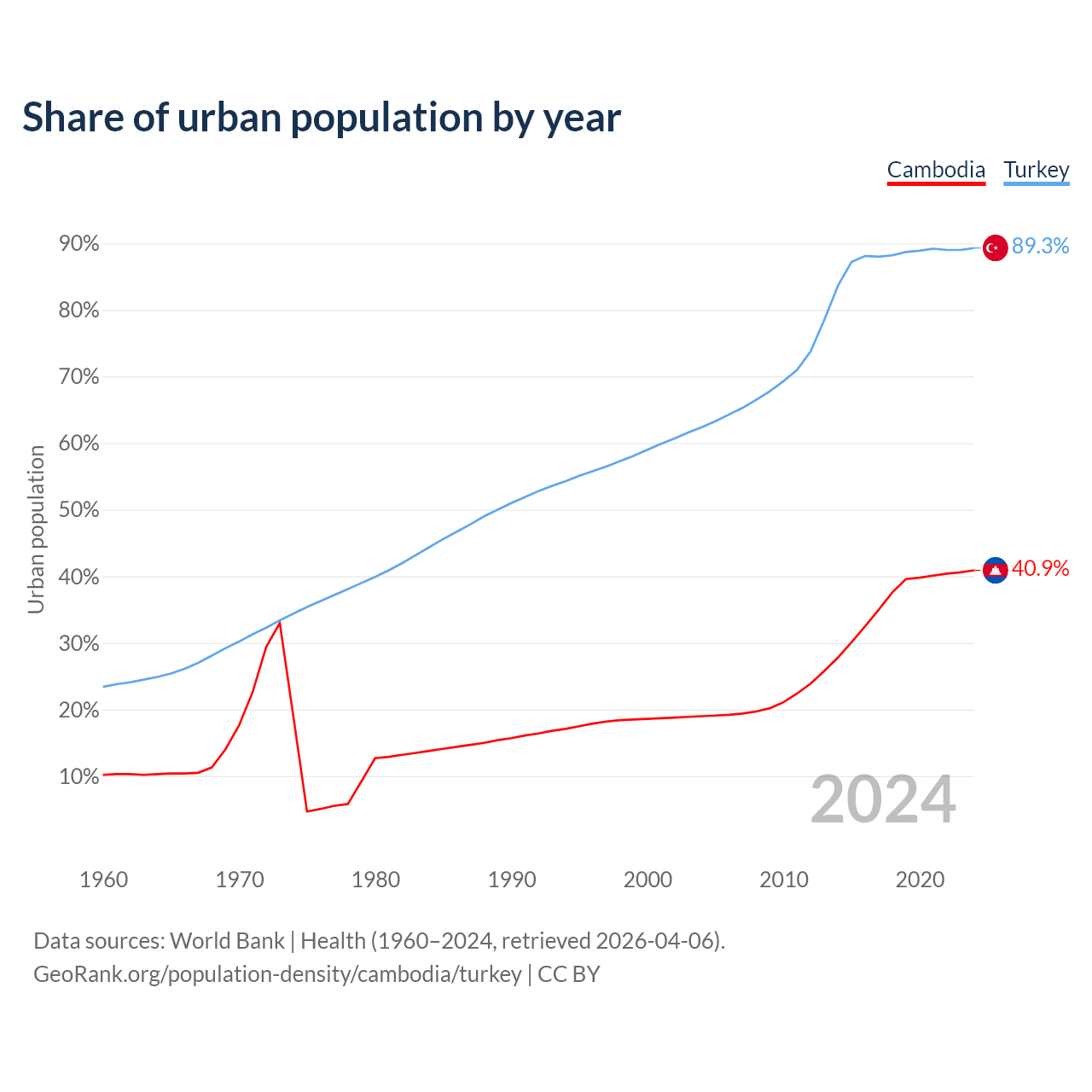 From 2004 to 2024, the share of urban population changed from 19% to 40.9% in Cambodia and from 62.4% to 89.3% in Turkey.